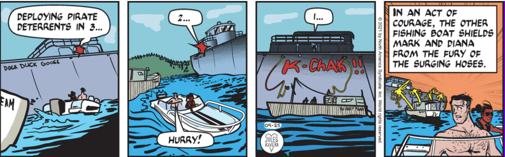 I mean, c’mon! Neither boat was in any real danger, except from the undertow of the cargo ship, itself. Those fire hose defense systems aren’t designed to pursue pirate ships moving away from the ship. However, perhaps Rivera thought it would make an exciting action scene to have fire hoses waving all around and spraying water everywhere. But the result reminds me more of the robot on the TV show, Lost in Space, which would ineffectually wave its arms whenever it sensed danger. On the other hand, I would feel very insulted if this entire sequence of “dangerous mission”, furtive pursuit, dangerous reprisals, and unknown sacrifice was all just some kind of parody. I’d be much happier if this were just Rivera’s attempts to construct a classic adventure story.