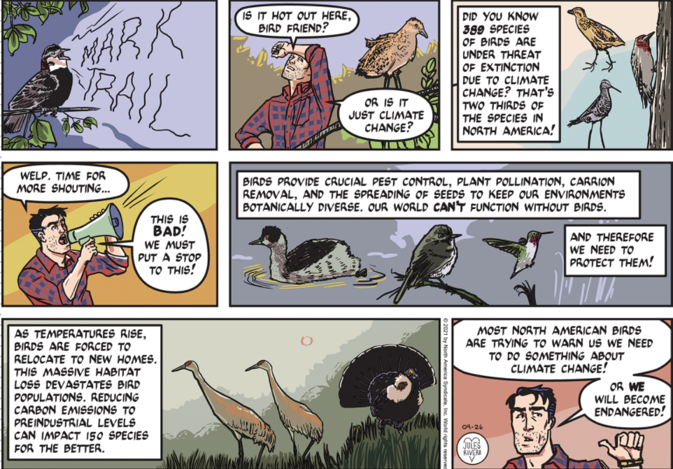 Other than showing a bunch of birds, how about a panel showing a before-and-after image of a bird habitat damaged by climate change? That could help make Mark’s case; and I’m not sure the penultimate panel makes that point clearly enough. Also, call me picky (I’ve been called a lot worse), but it seems to me if you are going to talk about actions birds take to help the environment, how about showing a few birds engaged in these actions, rather than just a bunch of “clip art” style examples where the birds are not doing anything?