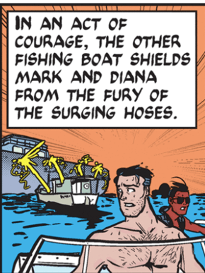 The madcap adventure drones on. In spite of the dubious “sacrifice” of the other fishing boat to allow Mark and Diana to escape, it appears that these so-called anti-pirate hoses are pretty wimpy deals. They look more like flat, yellow straps. And there is already one of them on Mark’s (or Diana’s?) boat! I reckon that their runabout is more of a floatabout, given they haven’t moved very far. Or have they?