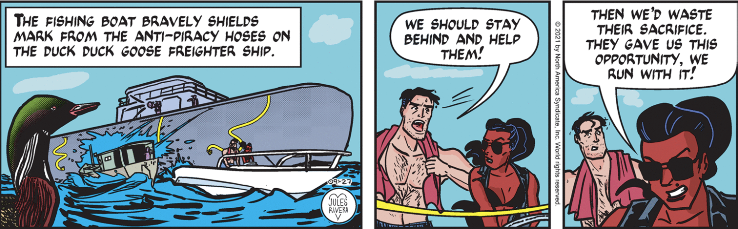 Recall that Saturday’s strip shows that these two were a good bit further away than we see above. In fact, they seem to be moving in the opposite direction from the cargo ship than they are today. Clearly, there is something odd in continuity. Perhaps they have fallen victim to the Chrono-Synclastic Infundibulum, first discovered by Kurt Vonnegut. This is where time and space tend to coalesce, allowing a person stuck in this situation to experience multiple timeframes (past, present, future). Perhaps that is not what Rivera had in mind, however.