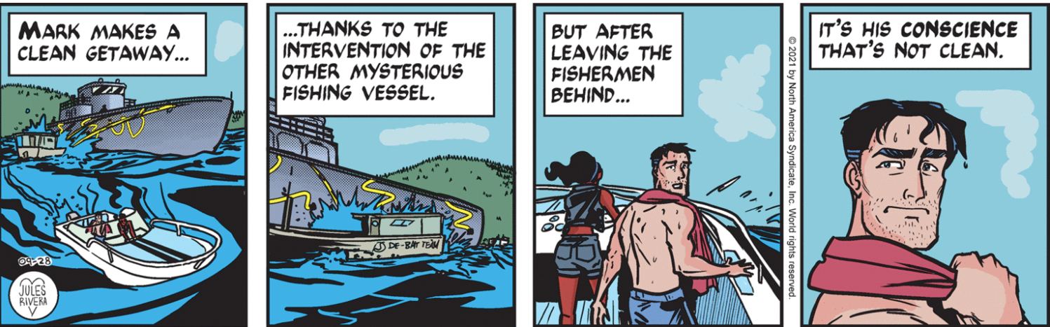 I was also going to comment on the contrary and unusual clouds in the four panels, but they do not appear in the black and white version of the strip. This makes me believe that the syndicate colorist put them in, apparently as a poorly conceived afterthought. Too bad some people will think Rivera is responsible for them. But the drawing of Mark in panel 4 is well executed, clearly showing he has a more sophisticated collection of emotions than his predecessor.