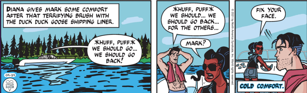 It is easy for long-time readers, I believe, to think that Rivera is making sport of them, if one reads captions like that in panel 1 as parody: “Terrifying brush with the Duck Duck Goose Shipping Liner.” Really?! There was nothing really terrifying about it, of course. Absurd, perhaps. So Mark and Diana’s escape concludes with Mark still wracked over his moral dilemma, which Diana has so far resolved by telling him to stuff it.