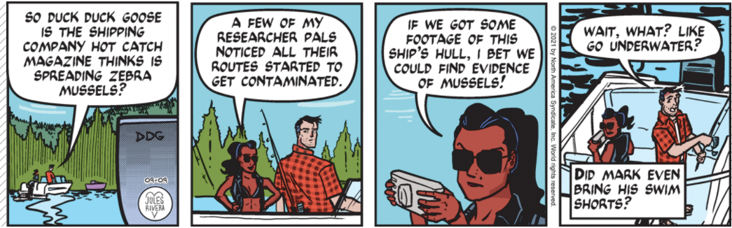 Okay, Rivera threw us a small misdirect about who was going to do the underwater research. Is today’s situation another misdirection for readers? As it appears Diana rented the boat (which is why she is the driver, as Mark declared), did she deliberately maneuver Mark into his “it’s a Man’s job to do the dangerous work” decision? So, while filming Mark getting ready for his gutsy and possibly fatal task, she tells Mark just before he dives to stop and not to be such a macho idiot. Then she reveals an underwater propulsion jet and some scuba gear that she happened to have stowed away in the boat. Thus, this particular setup is a way for Diana to get some of her unexplained need for vengeance against Mark by making him look foolish on video, which not only will wind up in her social media, but find its way into the zebra mussel documentary. Brilliant practical joke!