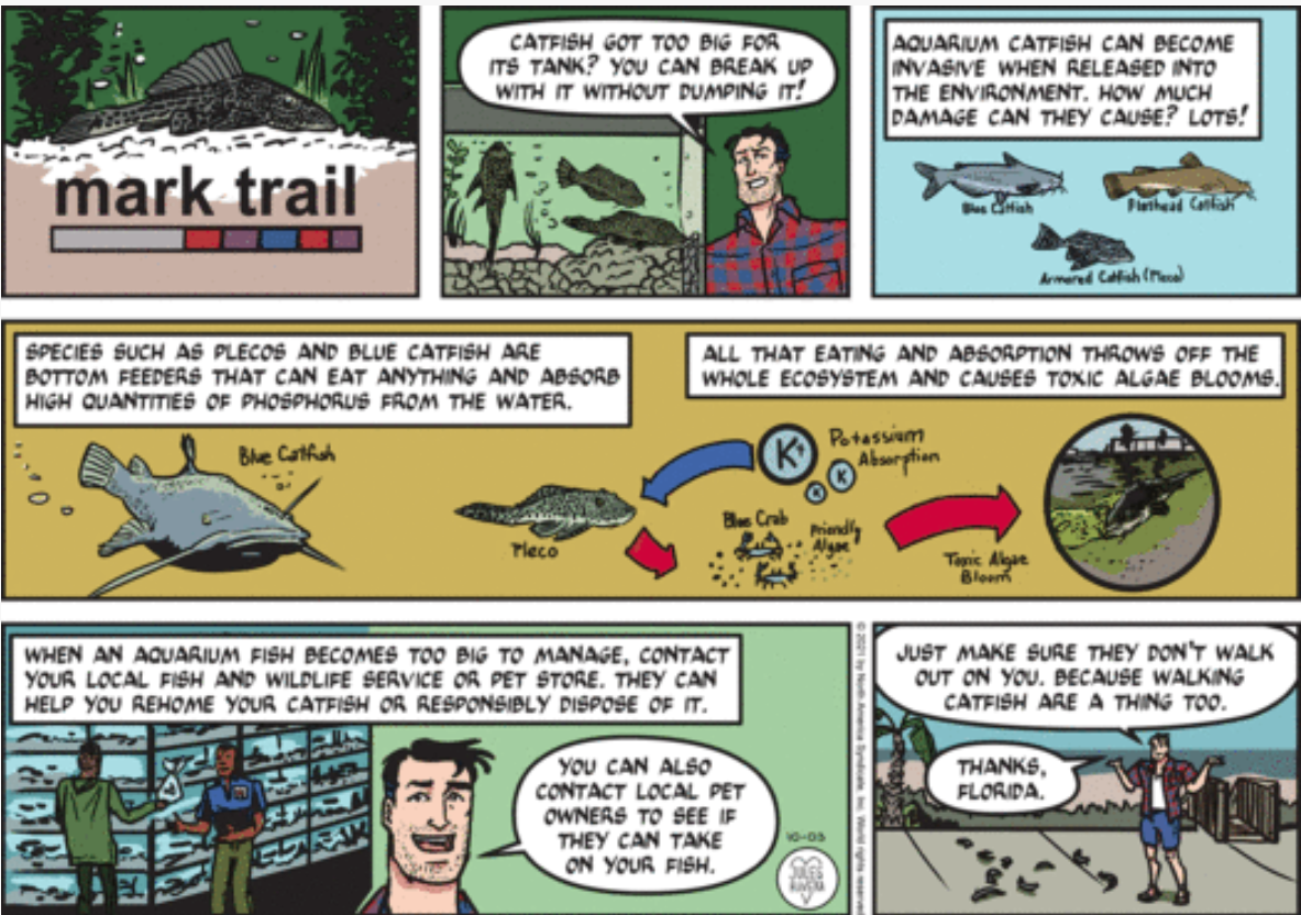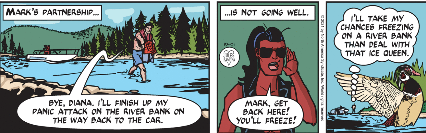 So, Cliff bears no regrets, no feelings of revenge for getting burned, so to speak? Well, it has been several decades in our timeframe, anyway. At least we can say one thing about the current strip: All the females and all the males do not look like they are related to each other! Nevertheless, let’s see how this side-trip in the story pans out. Will Cliff get involved in the mysterious zebra mussel affair, or does he have his own hidden agenda to derail Mark’s investigation? Funny thing about that: That’s exactly what Cliff did in a story back in 2011, when he attempted to stop Mark from searching for the source of a gold band with a Biblical verse Mark found one day. For those interested, you can read a few posts from the former blog of illustrator Shawn Turner (Shawn, Drawn), starting with his November 2011 submission: (http://shawndrawn.blogspot.com/2011/11/mark-trail-grows-cold.html).