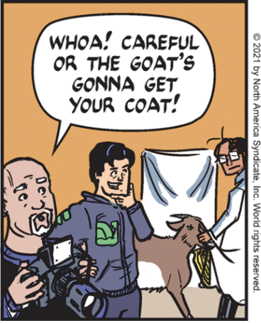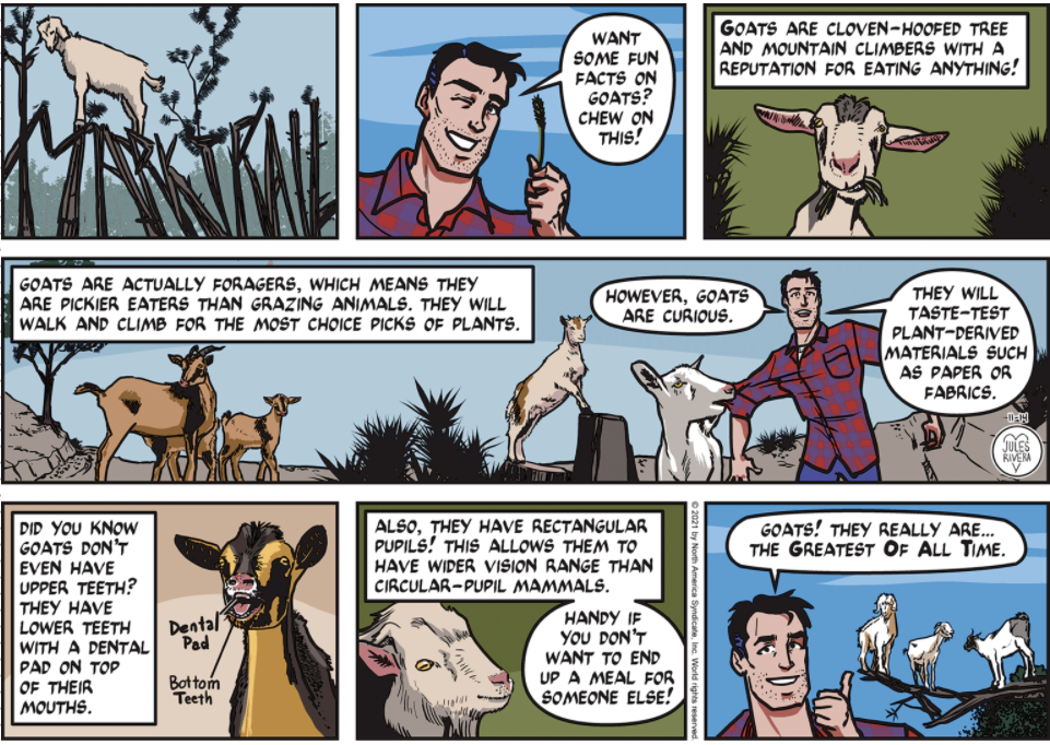 Another interesting title panel for a non-surprising subject. It would have been clearer for Mark to point out that the cliché of goats eating anything is not accurate. So forget feeding them your empty cans; they are just herbivores. I’m not sure I can go with Mark’s attempt at acronymic humor in the last panel, though they may be the greatest buttinskies of all animals . On the other hand, the image of a goat “testing” Mark’s shirt in the central panel is both relevant to the discussion and humorous. I think we have to recognize Rivera’s bias (as it were) to focus on goats, themselves, rather than on their additional existence as resources for human consumption (fabric, cheese, meat, etc). It’s a reasonable approach, as Rivera only stated she was delivering a few “fun facts.” There’s only so much you can cram into a Sunday strip.