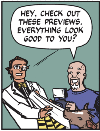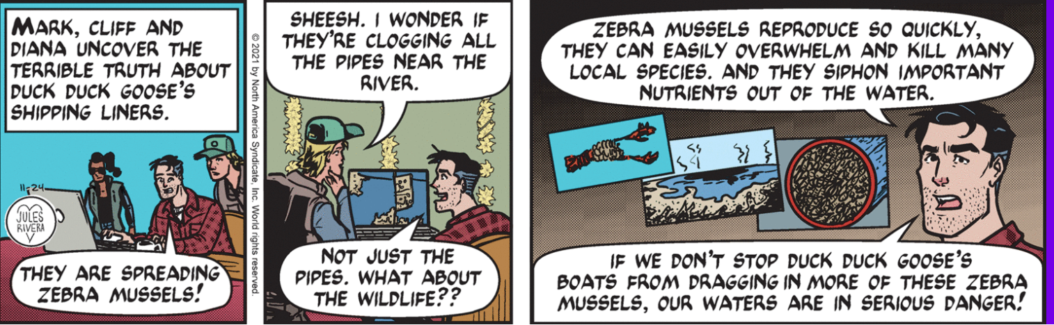 Rivera diverted from the main storyline (Remember, it is the search for Zebra Mussel smugglers!) this week. She expanded on Diana Dagger’s earlier confession to Mark and Cliff that her friends back home had diverted her income into trendy and controversial NFTs. This week’s strips feature (I think) a mini-parody of the world of NFT Development, as seen through the machinations of Cricket Bro; his financial backer and co-conspirator, Professor Bee Sharp; and one very hungry caterpillar, er, goat (okay, the goat isn’t exactly eating the lab coat, but I couldn’t pass up an opportunity to make the Eric Carle reference).