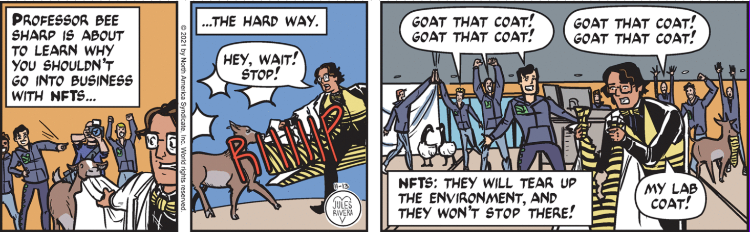 Oh, I do like the way that Rivera distinguished the plural form of “NFTS” in Diana’s dialog by bolding only the letters N-F-T. The word would normally be written as NFTs, except that full caps are always used in the strip; hence the bold font formatting. Okay, so you noticed that, too. I still like the effort.
