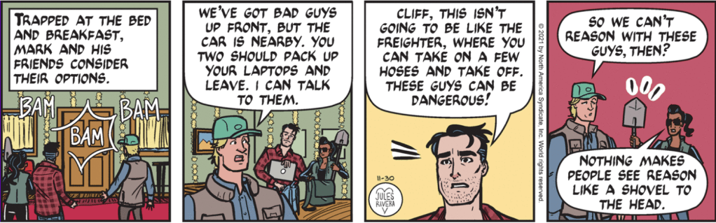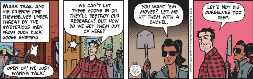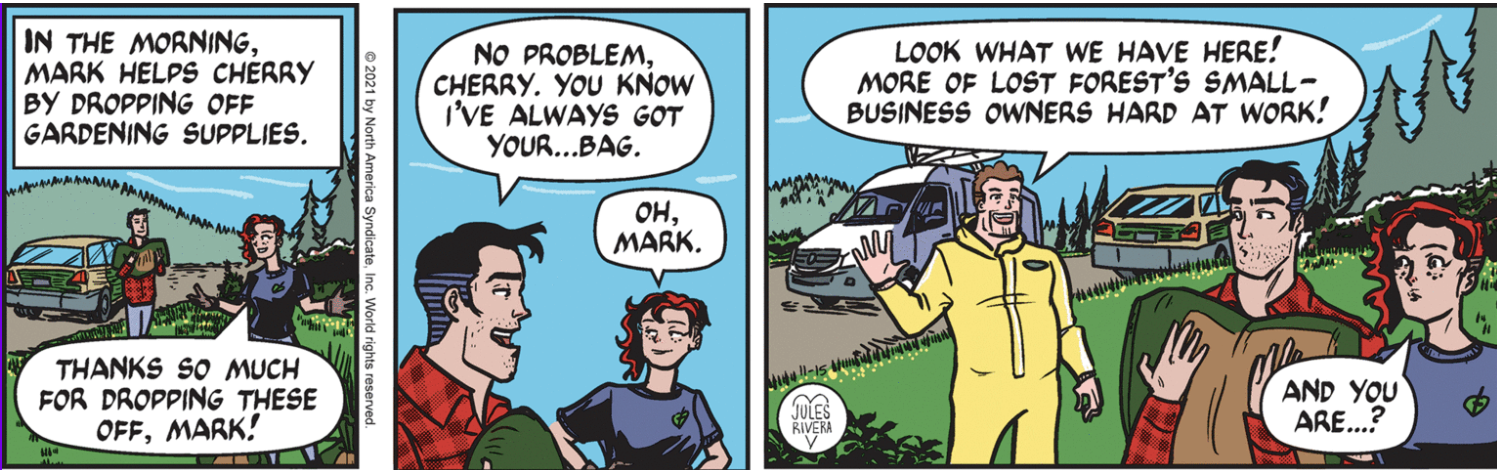 As we return to the main story, we find that Mark has left Cherry to her duties and gone back to his own work. Looks like they have set up shop in Diana’s B&B. Given this is Thanksgiving week, I wonder how many Turkeys Rivera will manage to stuff into the strips this week.