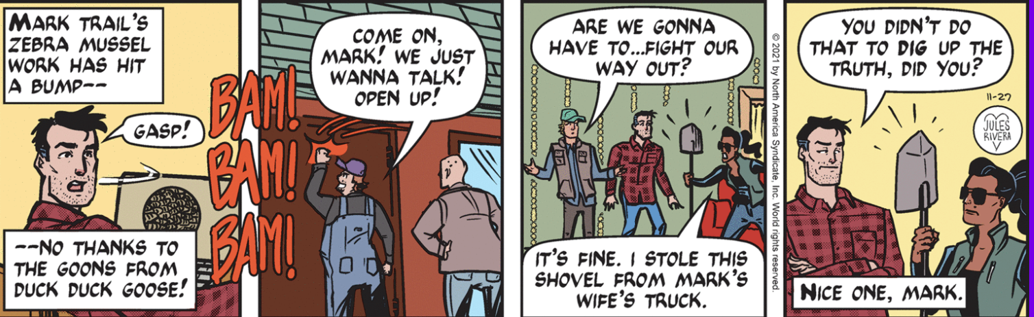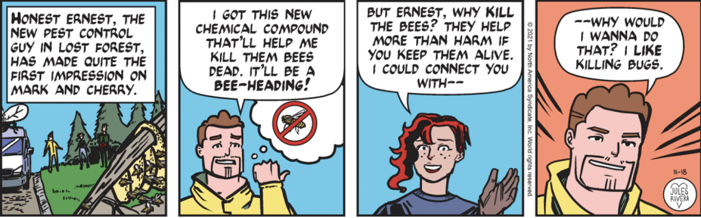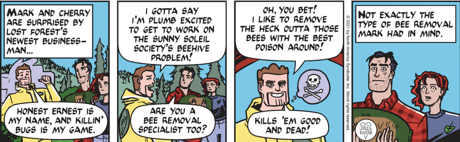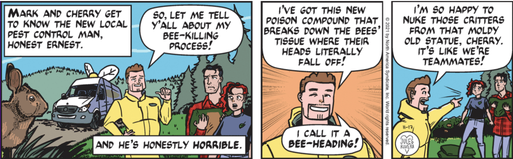 If you are up-to-date on the strips this week, feel free to skip down to the Sunday strip. For those of you who missed some—or most—of this week, Cherry and a surprisingly available Mark were working on all things gardening. A work van pulled up, out of which stepped “Honest Ernest”, a Good Ol’ Boy in yellow coveralls, who turned out to be the exterminator hired to kill the bees in the Sunny Soleil Society’s garden. In fact, this entire week of strips (about 5 minutes “in Trail Time”) was devoted to Honest Ernest first annoying, then shocking, the Trails (and us) with his phony “aw shucks” patter and sociopathic attitude. The Trails mostly just stood there, mouths agape; though Cherry once again put forth her weak bees defense, repeating her earlier failure to convince Violet and Caroline (Ernest’s wife). Once Ernest left, Cherry recovered enough to reiterate her intentions to raid the garden overnight with the help of her Garden Mafia to remove the bees to safety. Surprise of surprises, Mark offered to help, apparently indifferent to his current zebra mussel assignment.