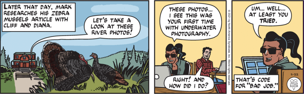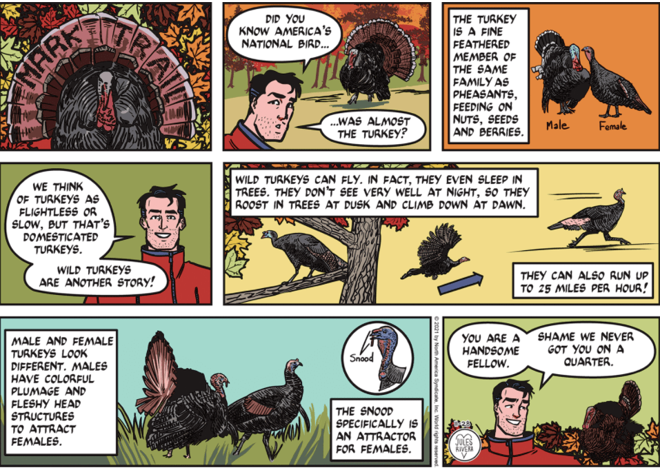 As usual, Rivera gives us a nicely designed title panel and a timely subject for the season. The turkeys are well drawn. They are found in neighborhoods and other public places, not just in country fields. I often see them walking around the university campus. Okay, turkeys are an easy subject. I’d like to see Rivera use Sundays to bring reader attention to lesser-known animals and nature topics.