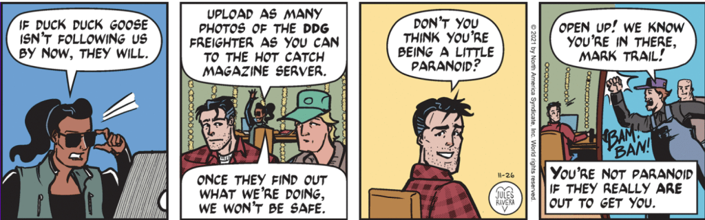At first, I thought this might be one of the thugs sent by the Duck Duck Goose shipping company to persuade Mark to back off. But, that would be integrating the two storylines. As I wrote before, I think that would be a great idea; yet it doesn’t have that feel. My guess is that Mr. Yellow Jumpsuit is the extermination business husband of Caroline (a board member of the SSS), who has come around to “put the little woman in her place”, as it were. Clearly, his truck has that “business” look and it appears to have something on its top. Possibly a stereotypical “bug” figure. And that’s why Mr. Yellow Jumpsuit also hides the logo on the side of the work van. The Big Reveal is on Tuesday.