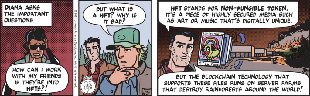 Full points to new reader “cellardoor2122” for his prescient comments yesterday on whether Rivera would focus on the link between NFTs, crypto-currency, and environmental pollution, as opposed to a more simplistic plot of Diana simply being hoodwinked. The jury is out on whether Cliff should be razzed for his lax grammar. Still, except for the articulated finger, that’s a pretty good drawing of Cliff in panel 2.
