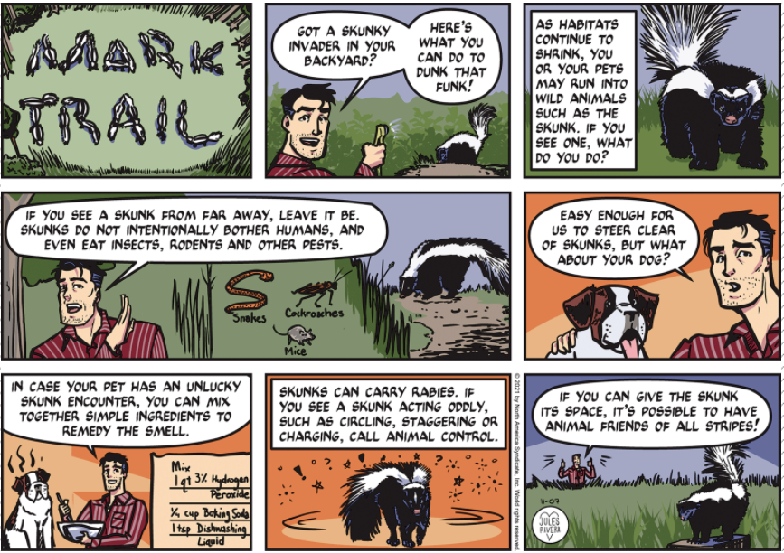 Avoiding a skunk is always a good idea. In fact, avoiding all wild animals is always a good idea. In spite of what some blockhead visitors to state and national parks believe, wild animals are not pets or your friends, no matter how cute they look.