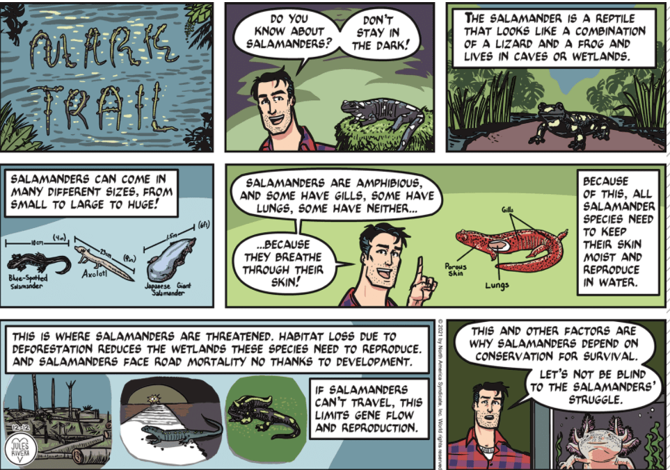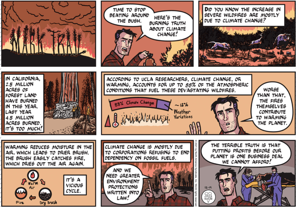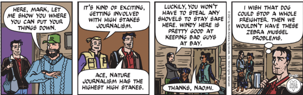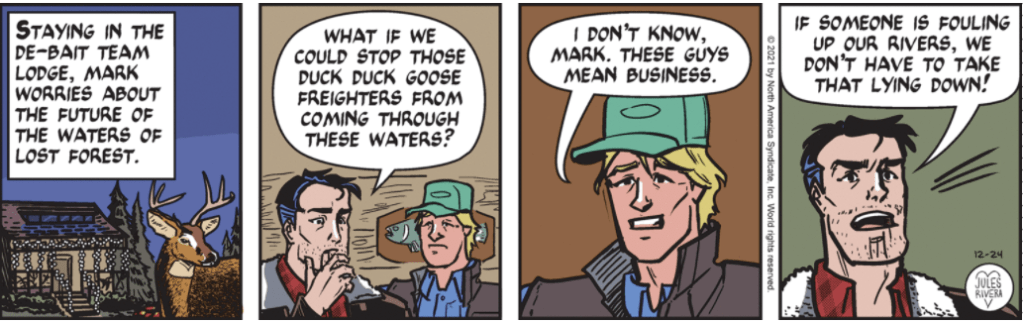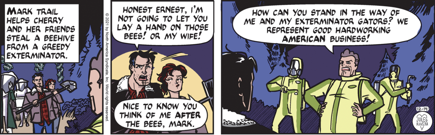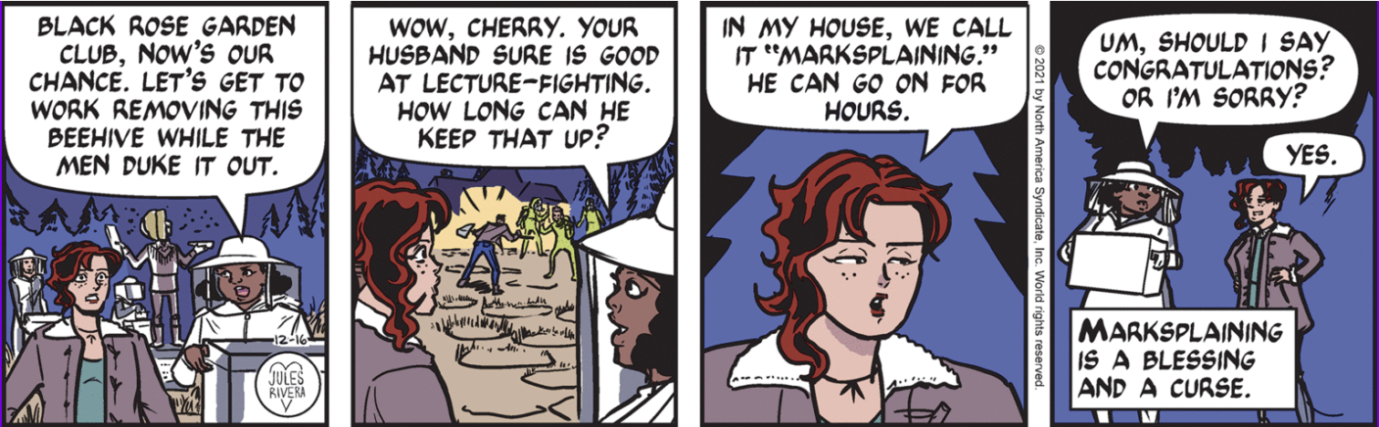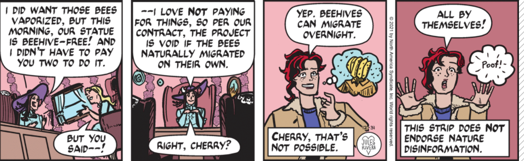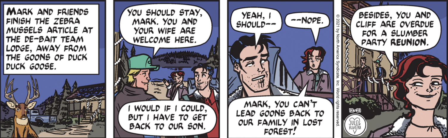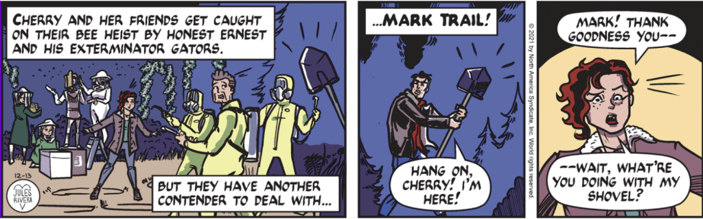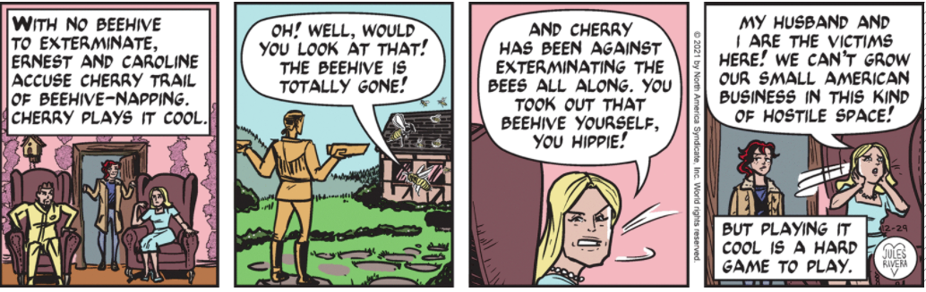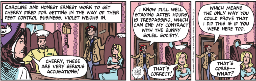 Finishing up, bonus points to Rivera for once again adding some variety—compositionally speaking—to the strip by placing the viewer in panel one down at floor level. From this angular, off-center point, the drama between Violet and Caroline is visually enhanced. But in panel two, Caroline and Ernest are reduced to silent chairs (i.e. the drama is over) flanking Violet who sits in the dominant central location to issue her decree. To conclude this royal farce, we hear from the court jester.
