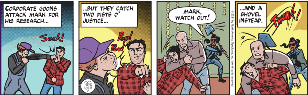 After three days of watching Boffo hit Mark, it’s nice to finally see the favor returned. Well, we take our FOJs where we find them. If we can believe our eyes and Rivera’s drawing, a reversal of fortune should result in these two corporate yokels being the ones tied to chairs and getting interrogated. Best leave that to Diana.