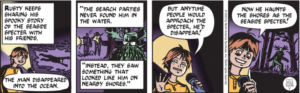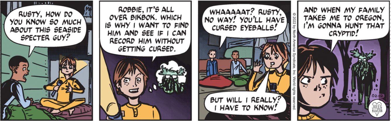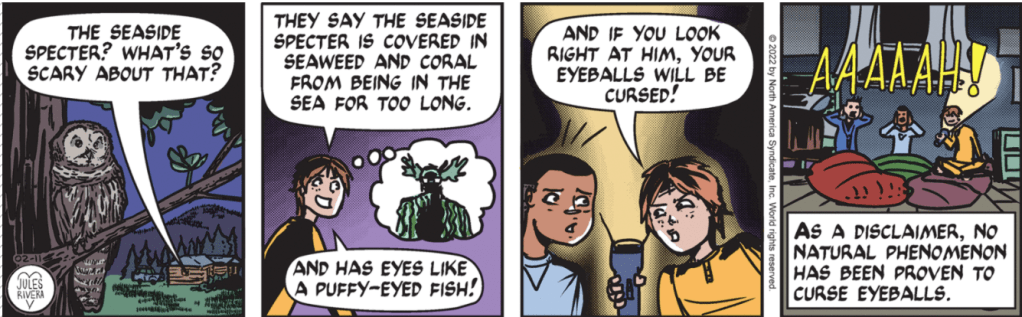 This past week featured Rusty and his sleepover buddies sharing stories about cryptids (the Yeti, Loch Ness Monster, Benny Hill, etc.). Rusty is so enamored over his own cryptid creature (“Wilbur,The Seaside Specter”) that he pledges to hunt it down when he and his family arrive for a vacation in Oregon (which is where the “Seaside Specter Guy” conveniently haunts the coastline). We don’t know yet why Mark has an itch to go to Portland, but with this past week of strips devoted to the lad, it seems we are getting prepped for another Rusty Adventure! Now, do you think he will get another female friend (like Mara) to help with his investigation? Before you submit your response, take a moment to love today’s educational nature strip!