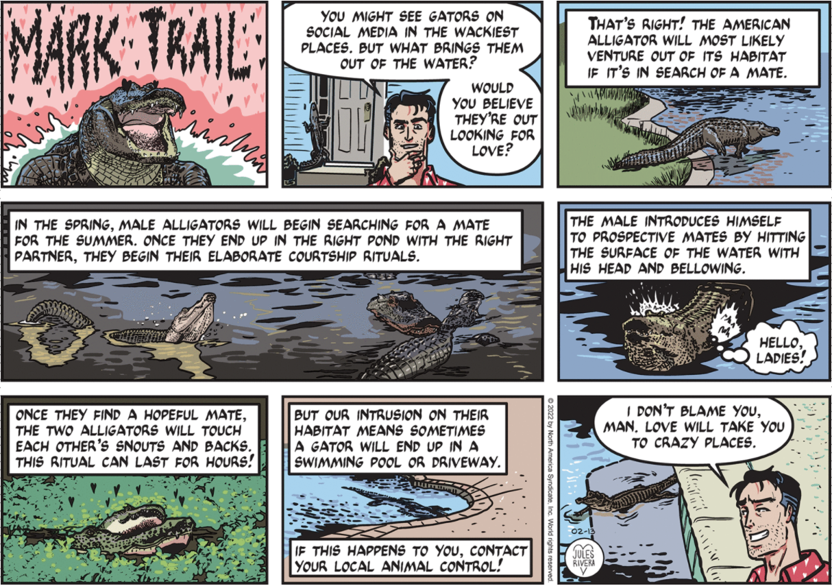 It appears that the title panel is composed of “alligator hearts”. Given the theme, it makes sense. I’m thinking this is not the kind of alligator story we would normally see in a Mark Trail Sunday strip; and that’s a good thing. And it is informative. Not that I didn’t think gators mated, but I did not know the details. I think I missed that episode of “Nature” on public television. But I’m still not certain how gators culminate their mating: Missionary position? Flatiron? Doggie?