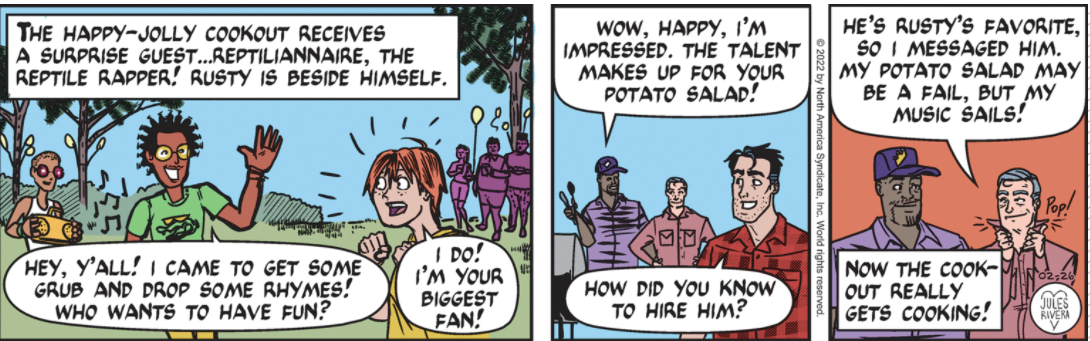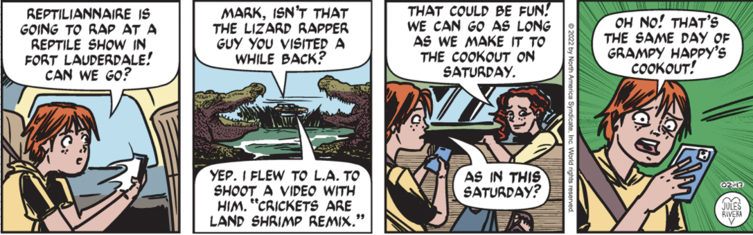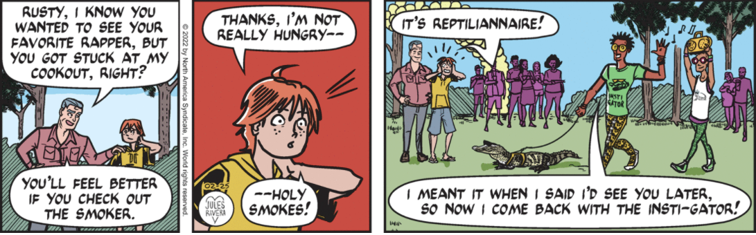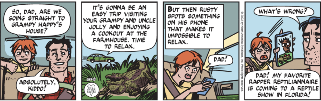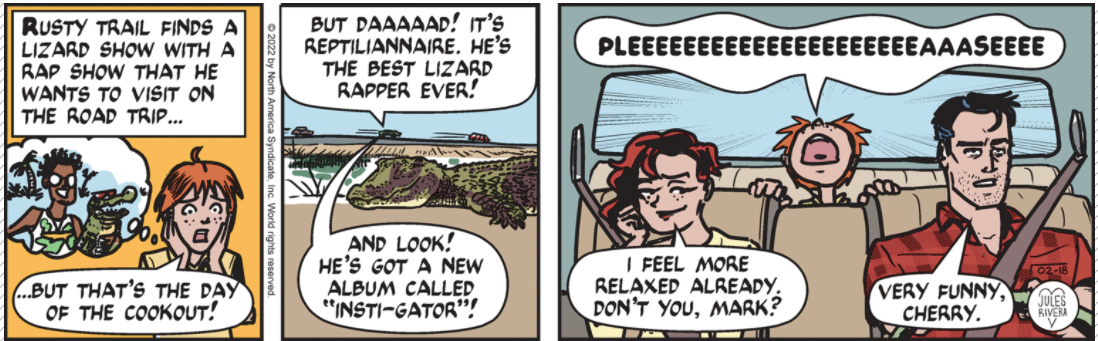 For those readers who missed the daily episodes, our story continues to focus on the travails of young Rusty Trail, stoically enduring a family cookout while his musical hero, Reptilionnaire, performs down the road. We daily readers shared his anguish, suffering through family reunion moments and the usual banal dialog one hears at family get-togethers. But the week ended up with Rusty (and his parents) very much surprised when Reptilionnaire showed up with his pet ‘gator and musical assistant. Good thing Rusty was not holding any of Happy’s potato salad, as his jumping would surely have sent it flying in all directions.