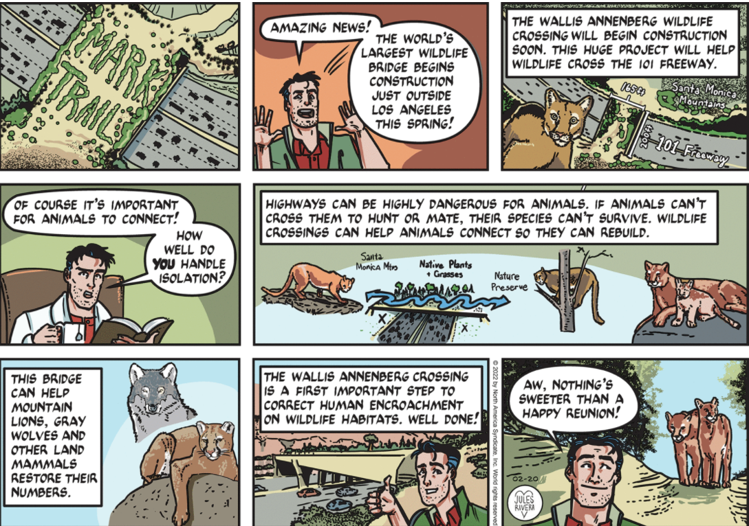 This is, indeed, a good project, and Wallis Annenberg is right to be proud of this project, which apparently won’t be completed until late 2023. And it received significant private donations. I’ve read that plans are to allow people to cross, as well. Sounds like a bad idea to me. I’m not sure how that is supposed to work in terms of not scaring off wildlife or endangering the public.