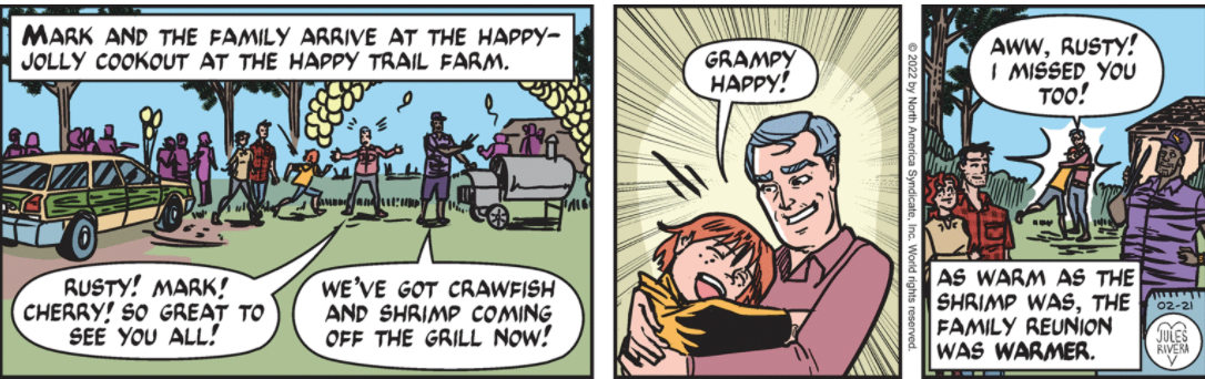 Okay, so “Happy-Jolly Cookout” it is! Happy and Jolly, huh? That sounds like a bad comic team. Still, the positive vibes are flowing all around. But for how long? We spent last week on the road, so will we spend all of this week at the cookout? If so, I’m expecting something to heat up besides the shrimp, or this story is going to start looking like a proposal for a Hallmark movie. Hey, at least Cherry is working the crowd. Rusty has grabbed Grampy Happy, so I wonder what Mark is doing? Chewing the fat with Jolly Roger, perhaps.