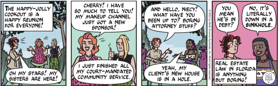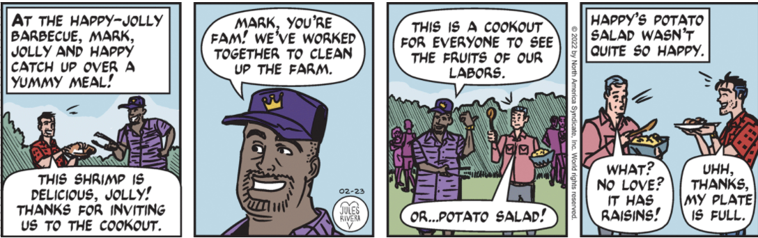 <Sigh!> A second week devoted to this cookout!? Can there be any importance in this extended interval before we get to any hoped-for action and intrigue? Well, I don’t see any storm clouds approaching or alligators crossing the lawn, so ho-hum. In fact, today’s panels look “mailed in”, as the saying goes, without much thought or design. A shame, as Rivera can clearly do a lot better. Sometimes I wonder if she is already getting tired of this gig. Well, I hope not.
