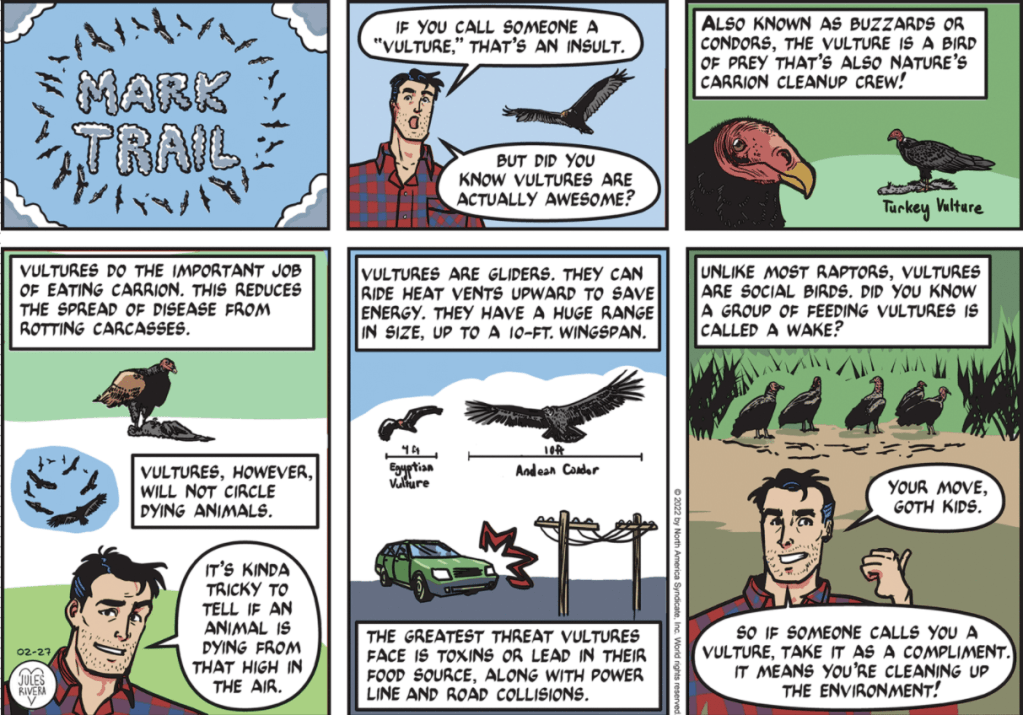 Gee, so vultures circle around carrion, huh? Does that explain today’s title panel? Okay, there’s more to make fun of, but I’ll leave it to others. If vultures don’t circle around dying animals, why do they bother circling at all? Didn’t get that answer. Interestingly, in most Sunday strips the animals take center stage, but today, Mark seems to get the main face time, with vultures playing backup. I’d rather see more vulture close-ups, Mark.