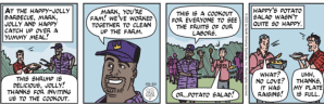 My thought is whether we should continue to post and view these panels in their online size or the newspaper size. I think in the latter case, a lot of complaints about artistic style or quality are minimized, so to speak. That is, images do not look so stark or odd. And that is likely deliberate, as Rivera is well aware of newspaper size reductions. Anyway, is this a valid observation or am I just talking myself into a rhetorical corner?