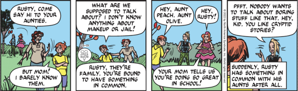 Otherwise, looks like Rusty’s fun rhyming time with Reptilionnaire didn’t last very long, as here he is, by himself on the lawn. He’s brooding, as if channeling Kenneth Branagh. Hey, we have to give Rusty credit for that nice burn in panel 2. But really, Rusty, having Mark as your dad, jail should be a well-known topic in your house.