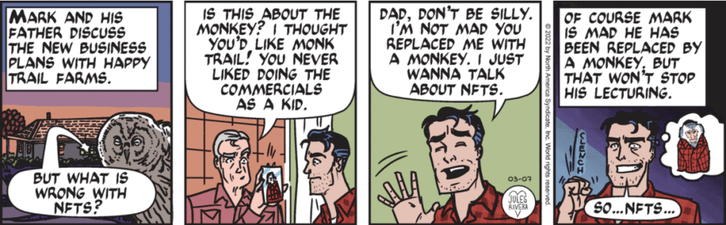Somehow, Pruneface must have escaped Dick Tracy’s clutches and elected to hide out in Florida, disguised as Happy Trail. I thought Rivera would follow the time-honored Trail Tradition of skipping over details and move us directly into the next phase of the story. Instead, the lecture on NFTs continues.