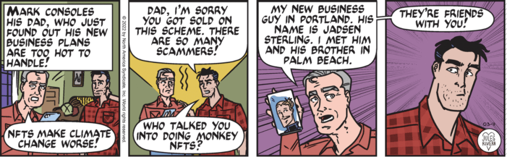 Anyway, it appears that my fears are correct and that this Jadsen Sterling character is the link to Cricket Bro. So, we can expect Mark to blow his top in Saturday’s strip when he realizes who Happy is doing business with.
