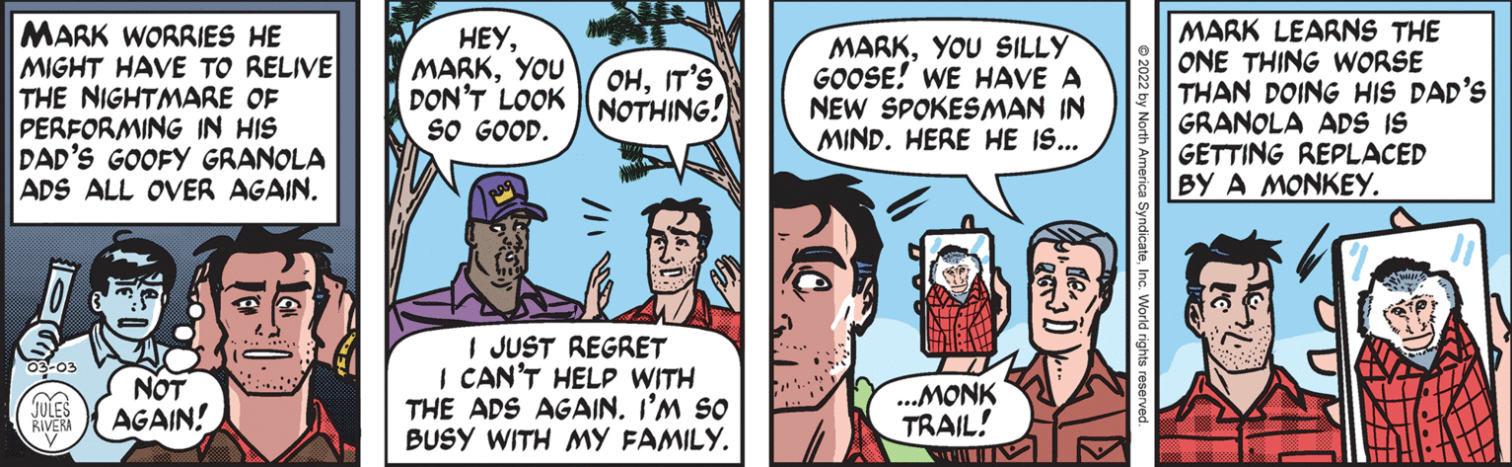 By the way, I just noticed that the new spokes-monkey for Happy Trail is possibly the same monkey that Rivera used as an example of an NFT in her January 2nd Sunday panels. Well, the same red shirt, at least. Go look it up. I’ll be around!