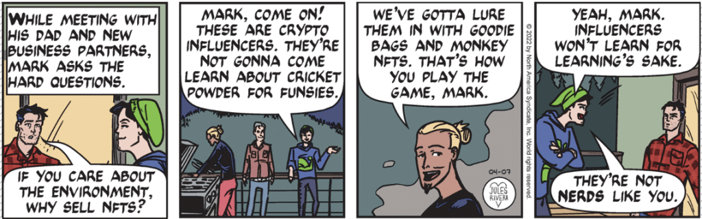 So, what’s with the “lure them in” blather in panel 3? From what I’ve read, NFT Influences are more than happy to chat with you, work on your product or idea, and take your money. It’s why they exist.
