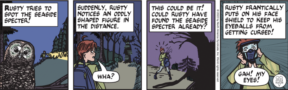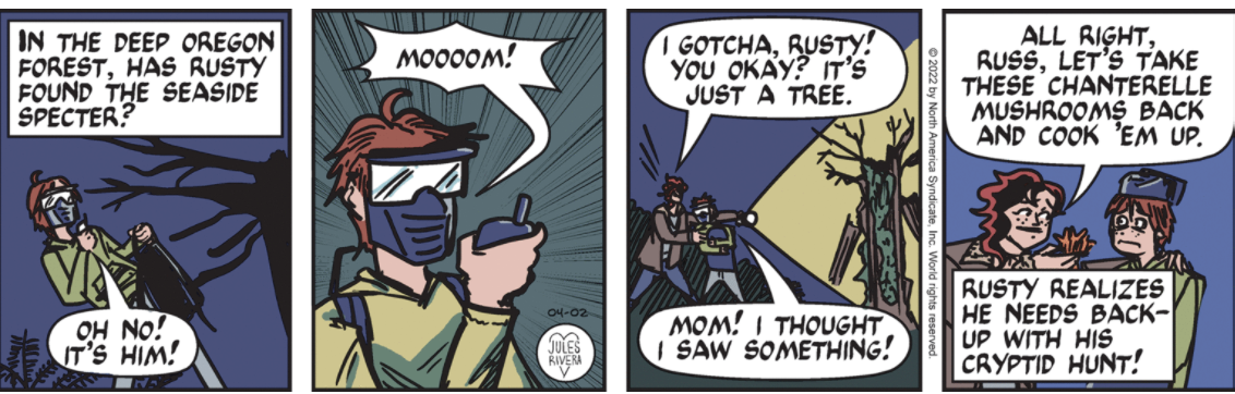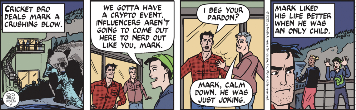 And Mark almost came to blows with Cricket Bro over a lame joke/insult. That part sounds rather topical, doesn’t it? Except that these strips are submitted many weeks in advance, so it is just an interesting happenstance. Cherry’s just-in-time arrival on the scene Saturday silenced the nattering nabobs, freezing them in place while demonstrating once again that…uh, that is to say, men don’t like to be caught out by women acting in ways they likely think women act. Of course, squabbling and name-calling are signs of weakness! But once again, Mark is out of his depth and unable to respond properly or take charge of the situation. Best he makes a tactical retreat and reconsiders his options. One of those options has to be the Sunday nature lesson: