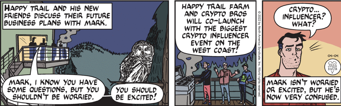 Well, in terms of action or story development, nothing happened. Instead, the week was spent with Pappy Happy and the Bunco Brothers trying to convince a skeptical, if confused, Mark about the validity and viability of their need to work with NFTs and their originators in order to attract NFT Influencers and gain their support to sell Cricket Powder. Got it? Sounds like a crock? Of course it does!