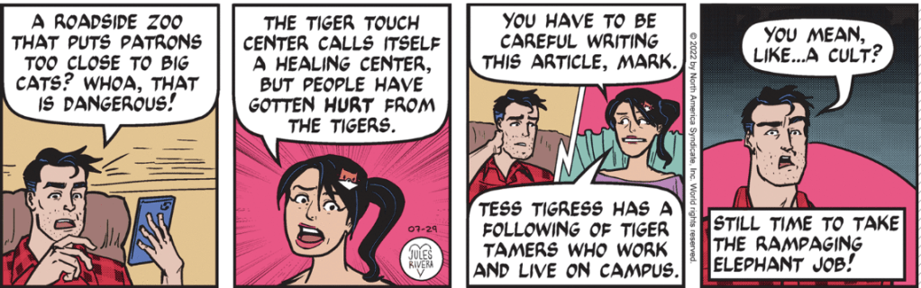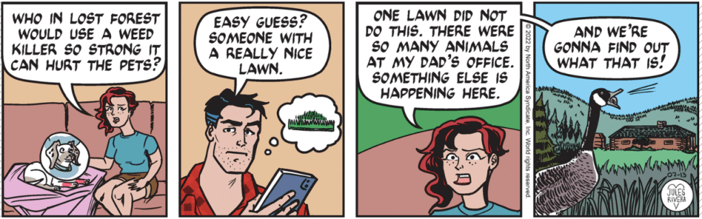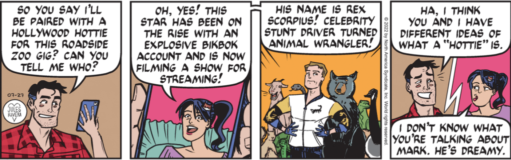 I am both apologist and critic of the Mark Trail reboot. I admire Rivera’s gutsy efforts to bring the strip into a contemporary setting, as off-kilter, reactive, and nutty as you would find in any Florida-based piece of fiction. I liked her original artistic vision of the strip during its early months, before the art became more simplified and sometimes erratic. In part, I see that due to unforeseen pressures of deadlines, but I could be completely wrong!