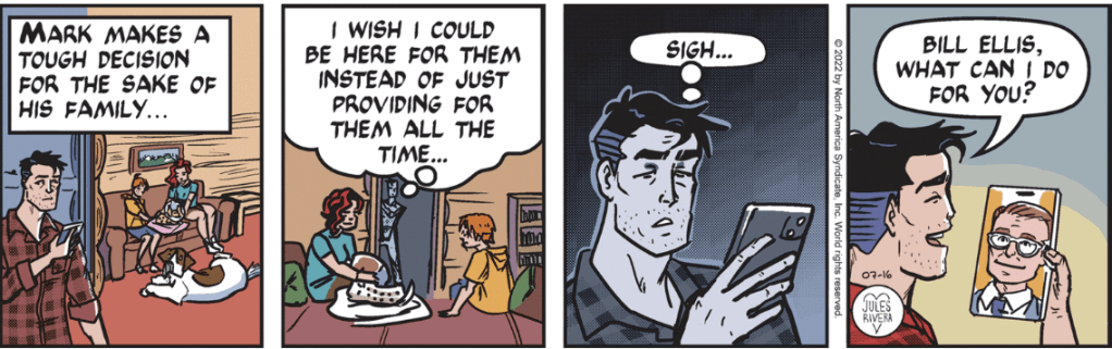 Jules Rivera’s aesthetic, coming out of non-mainstream art styles popular with online comics and graphic novels, has been a lightning rod for controversy, scorn, and even positive support. Her stories have also received their share of snark and appreciation. Not that that is new, of course. The legacy Mark Trail has long been a popular target for its cornball and illogical stories, its sometimes-uneven old-fashioned artwork, a reliance on cut-and-pasted poses, stilted dialog, and simplistic morals. Oddly, they have also been the strength of the original strip for many who cherished its sameness. It’s one reason why reruns of old TV shows are still very popular. Just ask my dad!