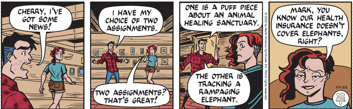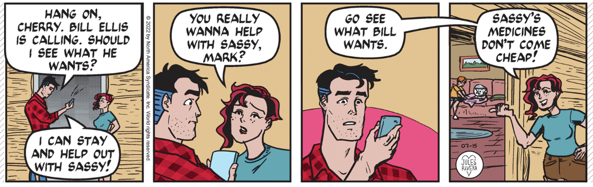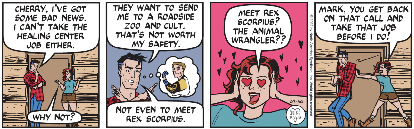 I am very glad to see Rivera giving Cherry greater visibility and her own adventures. In that way, she is more like the way Cherry was originally depicted when the strip first began, before she transformed into a conventional wife and mere supporting cast member. On the other hand, I am not a keen admirer of soap opera/sitcom elements that sometimes show up, especially during interludes between adventures.