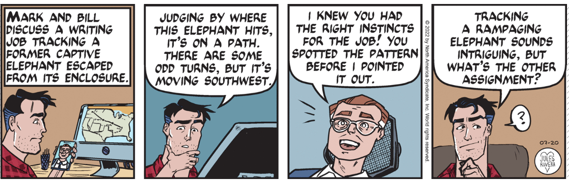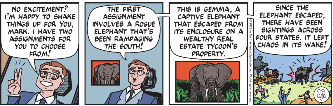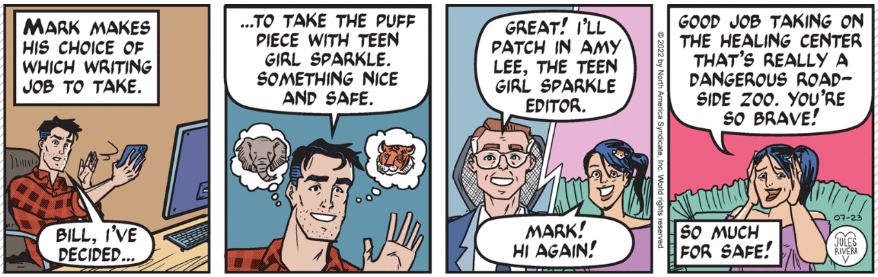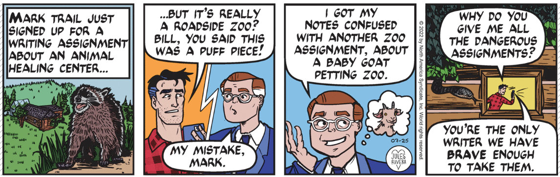 I am both apologist and critic of the Mark Trail reboot. I admire Rivera’s gutsy efforts to bring the strip into a contemporary setting, as off-kilter, reactive, and nutty as you would find in any Florida-based piece of fiction. I liked her original artistic vision of the strip during its early months, before the art became more simplified and sometimes erratic. In part, I see that due to unforeseen pressures of deadlines, but I could be completely wrong!