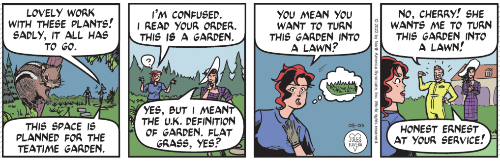 Oh well, back to Cherry’s small world of Big Problems. I’m glad to see that Cherry has a business and something to do other than wait for Mark to come home from his latest adventure. And there’s checking in on Rusty (if he hasn’t run off with the Seaside Specter) and ol’ Doc and his rash crisis. But doesn’t Cherry’s business have any other customers around which an adventure can be built? What about her secret garden commandos? Surely, there is a story to be found there. Instead, we have the Big Hat and the Big Mouth once again.
