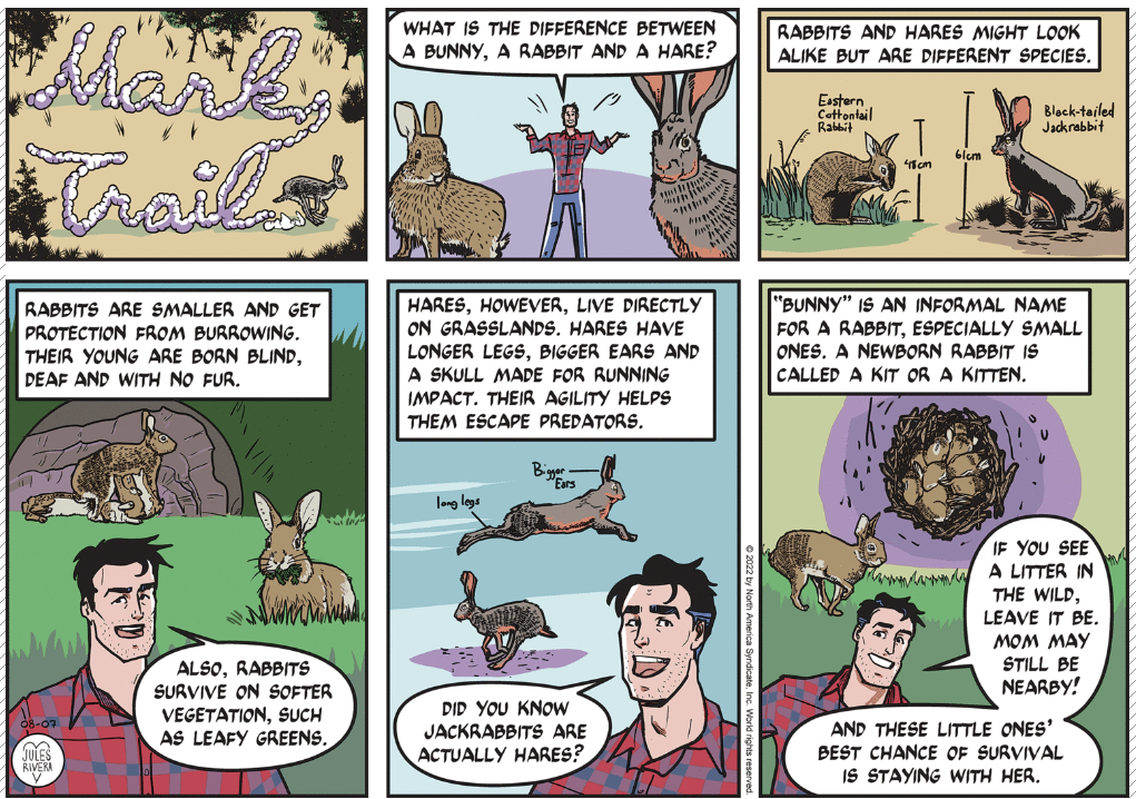 Well, a straight-up nature talk on waskily wabbits! Cool. I’m guessing that the title panel is composed of “speed smoke” from the racing hare, as in Warner Brothers, the source of the most famous carrot-eating member of the family Leporidae. We get a lot of rabbits in our backyard garden (an actual garden, not a mere backyard lawn). Thus, we also get various neighborhood cats passing through. Fortunately, no lynx has shown up. Feel free to quibble on details.