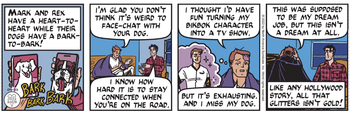 It is also surprisingly silly to assume that Rex could not have brought his dog with him while doing his show. I’m sure that kind of thing happens all the time. In fact, my minimal research confirms it is quite common. And how many times have we seen Mark “chat” with Andy on his smartphone? Irrelevant, as this is just another plot device, put here to provoke male bonding.