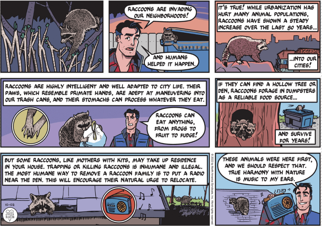 In Minnesota, it is legal to trap and remove live raccoons from your city property. I’m all for that. As far as killing them is concerned, that depends on the circumstances. “Inhumane” is a ridiculous and erroneous term. A better word is “cruel”. I have a younger brother who actually leaves food out for raccoons, though away from his house. Well, truth be told, my father does the same thing, and also away from his house. I think it is a bad idea. Wild animals are not to be coddled or trifled with. Get a pet cat, if you must, preferably an aggressive one that will patrol your yard at night and scare away the raccoons. “Here first” is also an over-used and simplistic argument. Rattlesnakes and poison ivy may also have been here first, but I wouldn’t let them continue to exist on my property.
