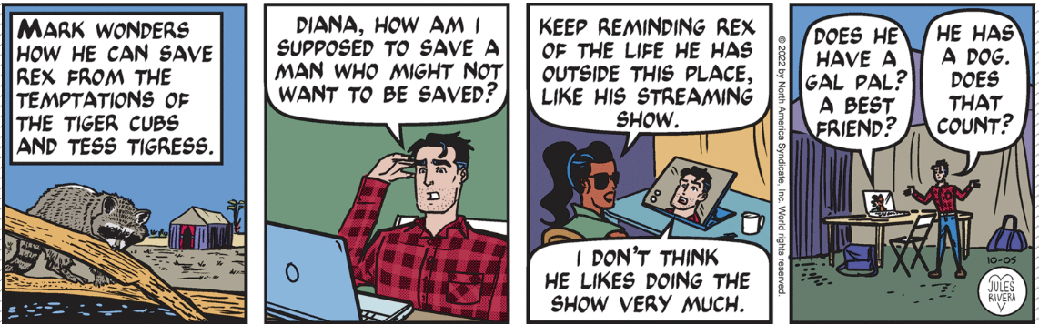 Speaking of awkward, this story has reached an uncomfortable fork in the road. It seemed to me a bit earlier that Diana must be emotionally invested in Rex, based on her subterfuge in getting Mark involved. But her advice today (from wherever the hell she is) suggests otherwise, and that she knows Rex about as well as Mark does, which is not much. Doesn’t she know anything about her boss? And what if Rex is right and they are wrong? How do they know at this point?