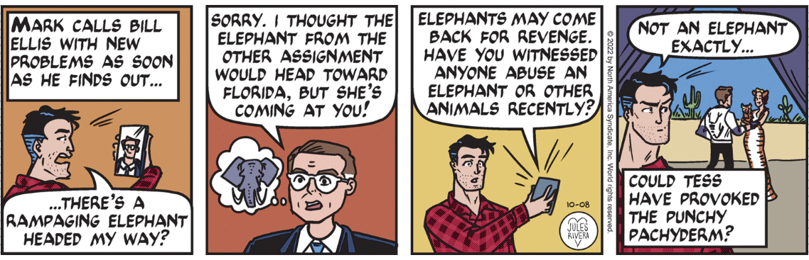 The notion that an elephant can simply run across the continental United States, unimpeded, pushes the boundaries of fantasy. Panel 3 is a leading question: How often would Mark see an elephant in any context, must less witness any abuse of an elephant…recently!? It’s been almost a decade since Mark was last in Africa. I suppose Rivera had to find a way to segue to the presumed misuse of tiger cubs, hence the “other animals” comment. But that stretches credulity in so many ways.