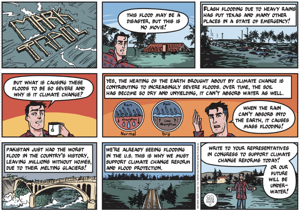 Jules Rivera’s approach to storytelling falls more in line with modern satirists, such as Carl Hiaasen, Tim Dorsey, and A. Lee Martinez, who pair crazy characters with crazy plots. Good satire is hard to pull off, which is why I don’t think you see it too often. Until Gary Trudeau got tired of it all, Doonesbury was a successful satirical comic strip with continuous storylines. And it took time for Trudeau to find his groove. Pogo was another great satirical strip, though too sophisticated for many readers. Yet, neither could be called “adventure strips” in the same way as Prince Valiant, Rip Kirby, Little Orphan Annie, Popeye, or the original Mark Trail, to name a few. And none of them could be labeled satirical, either. I believe Rivera is attempting a significant goal, combining adventure with satire (think Don Quixote, Gulliver’s Travels, or Indiana Jones).