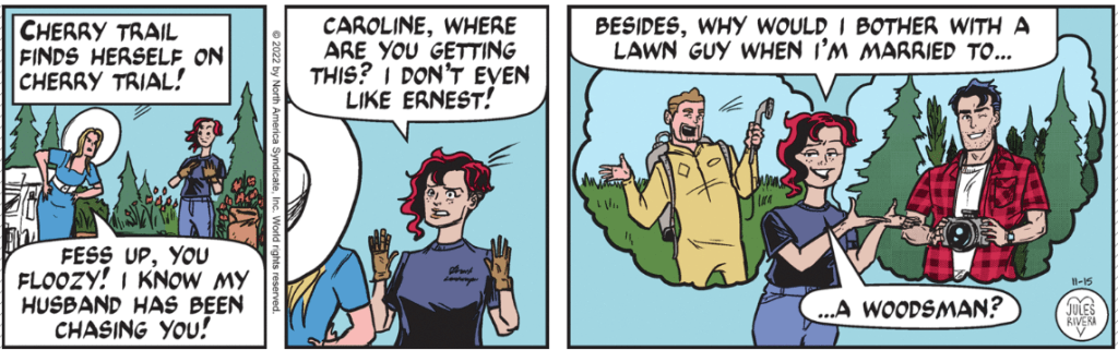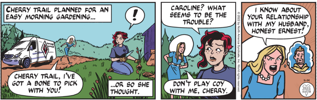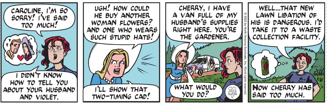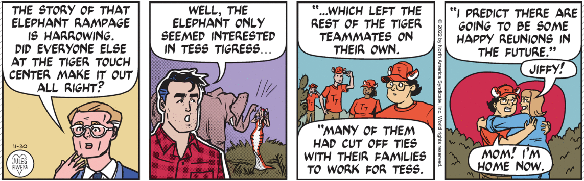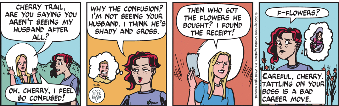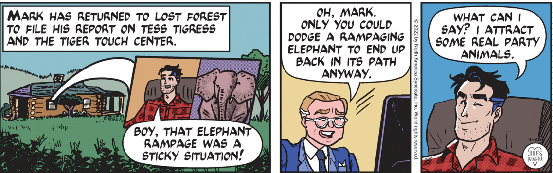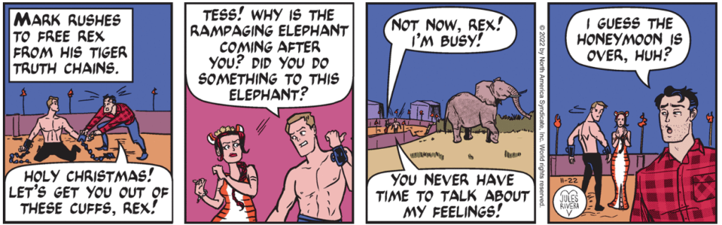 One possibly new development in comic strip anatomy (as far as I know) is the text balloon acting like a text box (panels 3 and 4), but with quotation marks. This is another method of distinguishing the present time while referring to the past, like the outlined Mark in panel 2. However, as a meme, its function is not so obvious. Perhaps italicizing the font (or changing the font) would help distinguish it from normal text balloons.