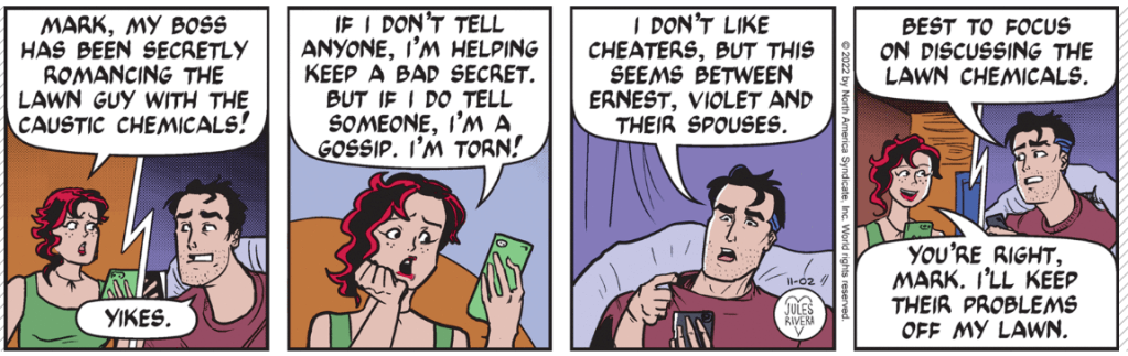 Sage advice, Mary “Marky” Worth. But now that you two moralists have done your righteous duty, can we get back to the actual story and leave this tripe for another comic strip, such as Blondie?