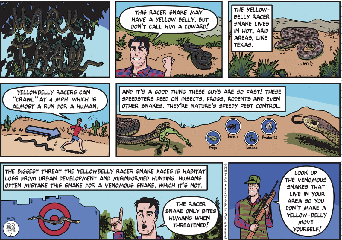 A very interesting creepy-crawly title panel today! I am not at all familiar with this snake, so I am now a bit informed. I’m surprised to see that Rivera continues to have a problem drawing the raised finger gesture (in the next-to-last panel) that Mark tends to use on Sundays. That pointing finger is always too flat and straight. Today, it looks more like a piece of wood stuck in his hand. Hands can be almost as tough to draw as feet. Yet, Rivera does just fine with Mark’s hand gesture in panel 2.