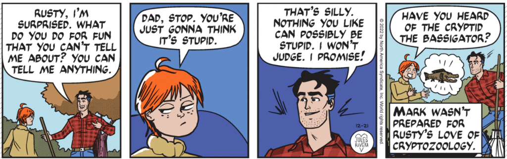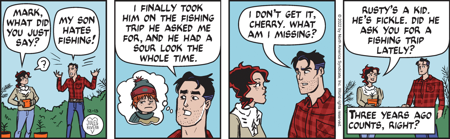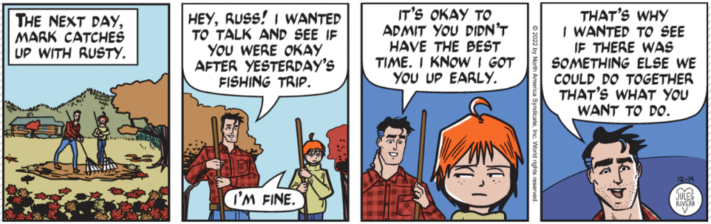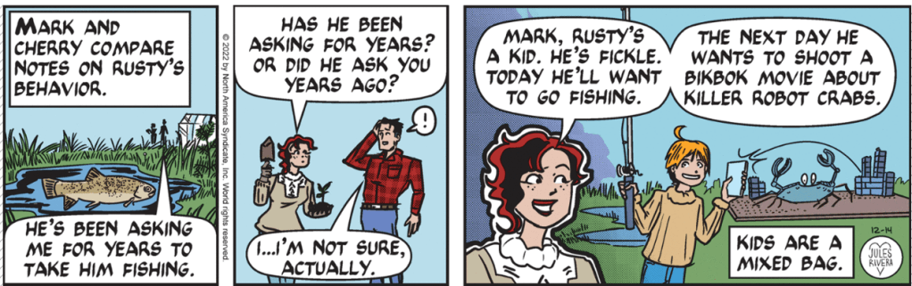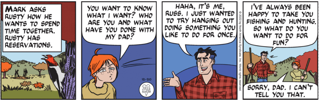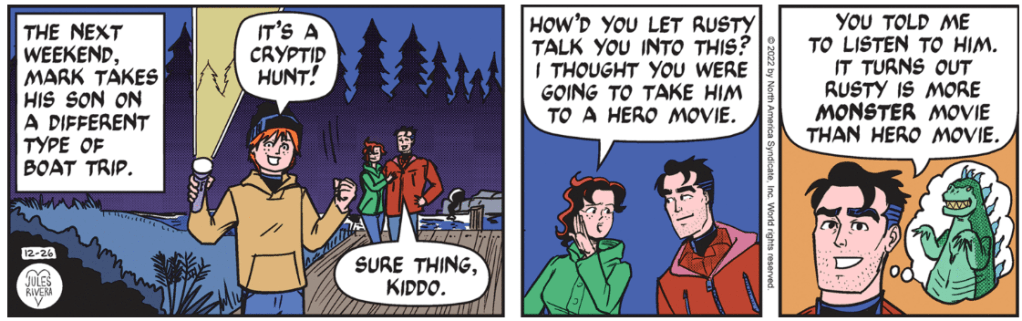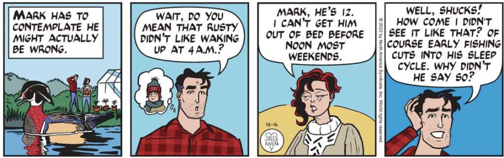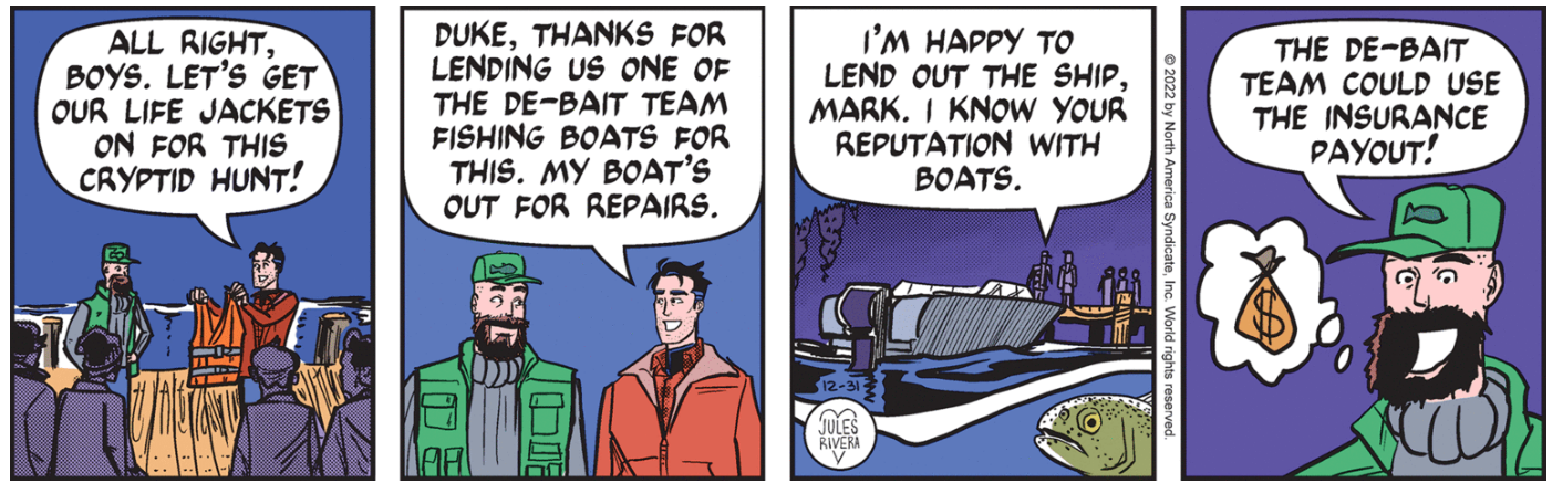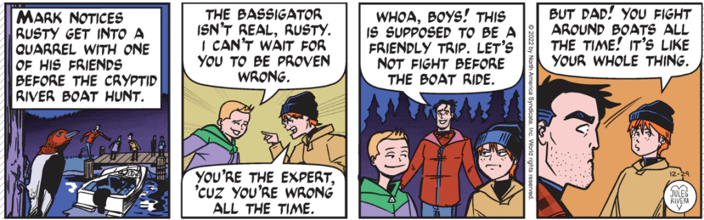 It also seems clear that today’s strip was deliberately composed only to set up the punchline about Mark’s reputation for destroying boats, the same way Capt. Kirk destroyed his uniforms. But it doesn’t move the story along.