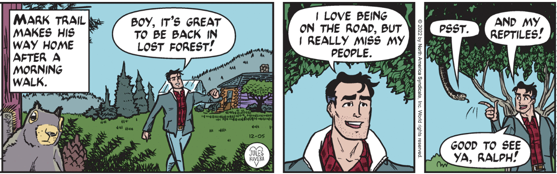Mark is nice and chipper on his walk. And why not? He’s done with his assignment and it’s a nice day. But does Mark have “people”? Doesn’t he mean “family”? He didn’t get elected the mayor of Lost Forest, did he?